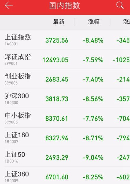央廣網北京7月27日消息 上證綜指尾盤急速跳水,跌幅擴大至8.48%,報3725.56。今日或創2007年6月以來最大跌幅。深成指報12493.05,跌幅7.59%;創業板指報2683.45點,跌幅7.40%。兩市逾千股跌停,再迎跌停潮。