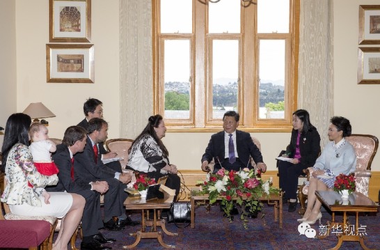 2014年11月18日,習近平在澳大利亞塔斯馬尼亞州看望已故前州長培根的家人。新華社記者丁林攝