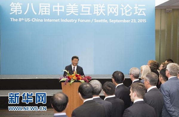 2015年9月23日,國家主席習近平在西雅圖微軟公司總部會見出席中美互聯網論壇雙方主要代表并發表講話。 新華社記者 黃敬文 攝