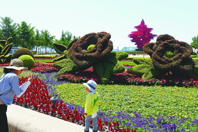 游人在青島五四廣場(chǎng)花壇前拍照。新華社發(fā)