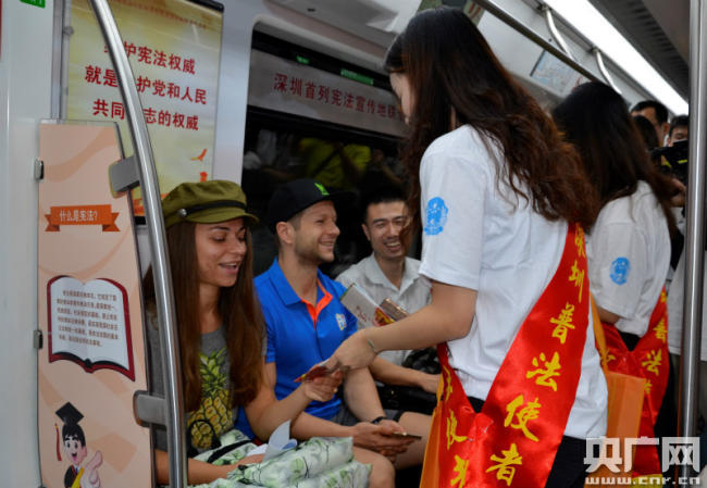 據(jù)了解,深圳市從11月下旬至12月下旬將集中開展憲法學習宣傳活動。全市普法工作者積極推動憲法宣傳創(chuàng)新,努力讓文本上的憲法“活起來”“落下去”,此次開通的深圳首列憲法宣傳地鐵專列正是深圳普法方式創(chuàng)新的有益嘗試。記者看到,普法地鐵專列外觀靚麗奪目,充滿了憲法法律元素,專列吸引了乘客的目光,不少人掏出手機駐足拍照。