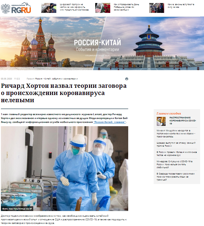 俄羅斯國家政府機關報《俄羅斯報》,發布題為《理查德·霍頓稱病毒起源陰謀論很可笑》的報道。報道稱,針對“病毒陰謀論”等謠言,霍頓說,這些說法非常可笑,但也要重視它們。“病毒陰謀論”對抗擊疫情是不利的,我們必須要了解病毒起源,并以科學的態度來研究它。