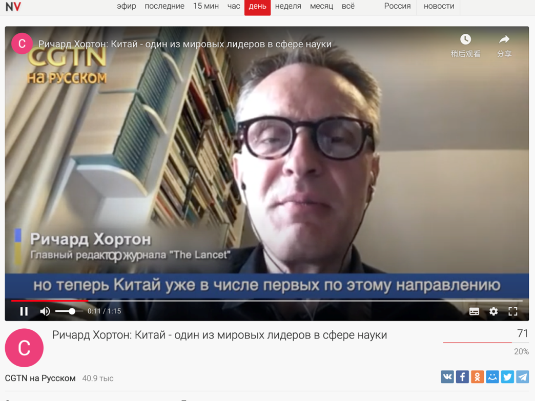 俄羅斯主流新聞網站newsvideo發布題為《〈柳葉刀〉總編霍頓:中國的科學發展已是世界領先水平》和《〈柳葉刀〉總編霍頓:中國的經驗是快速果斷的決策 中國有應對SARS的經驗》的報道。報道稱,中國醫生和科學家作出了最為杰出的貢獻,有一些國家的領導人批評中國,這是不公平的,也是錯誤的,我們應該感謝抗擊疫情的中國醫生和科學家。”