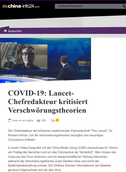 《歐洲時報》德文網發布題為《新冠病毒:柳葉刀主編批評陰謀論》的報道