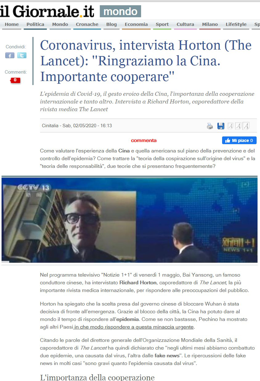 意大利《日報》:《〈柳葉刀〉總編接受專訪:感謝中國在抗擊疫情中作出的努力,國際合作至關重要》