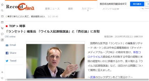 日本最大中國信息門戶網站“Record China” 5月2日發布題為《〈柳葉刀〉總編霍頓反駁 “病毒起源陰謀論”和“責任論”》的文章。報道稱,《柳葉刀》總編霍頓說,指責中國是疫情源頭沒有用、也不真實,中國有很多經驗值得世界學習。