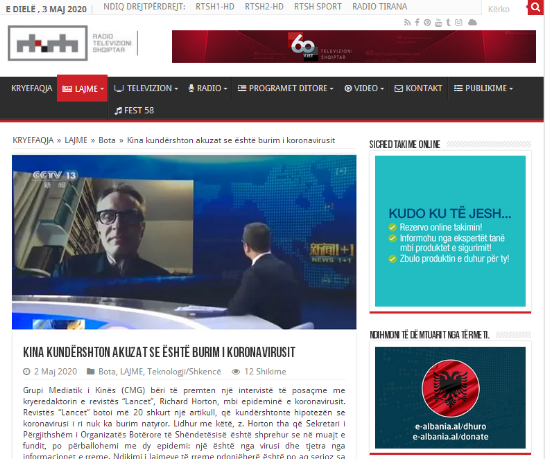 阿爾巴尼亞國家廣播電視臺官網RTSH:《中國反擊病毒起源論》