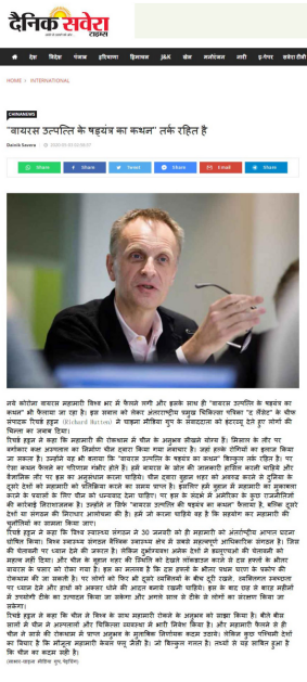 印度主流報紙《每日晨報》官網5月3日轉發總臺印地語部題為《“病毒起源陰謀論”站不住腳》的報道,國際著名醫學雜志《柳葉刀》的主編理查德·霍頓在接受總臺采訪時表示,“病毒起源陰謀論”和“責任論”是無稽之談,根本站不住腳。