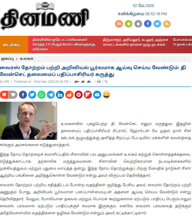 印度泰米爾文主流媒體《每日鐘聲報》網站報道《〈柳葉刀〉主編表示應對病毒起源進行科學調查》。