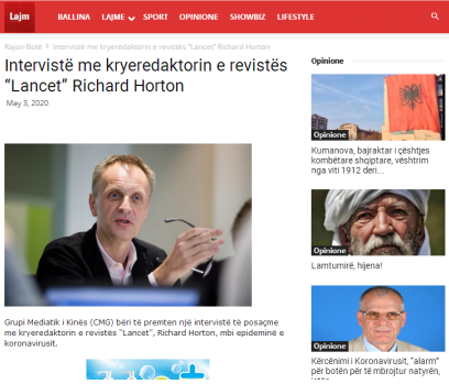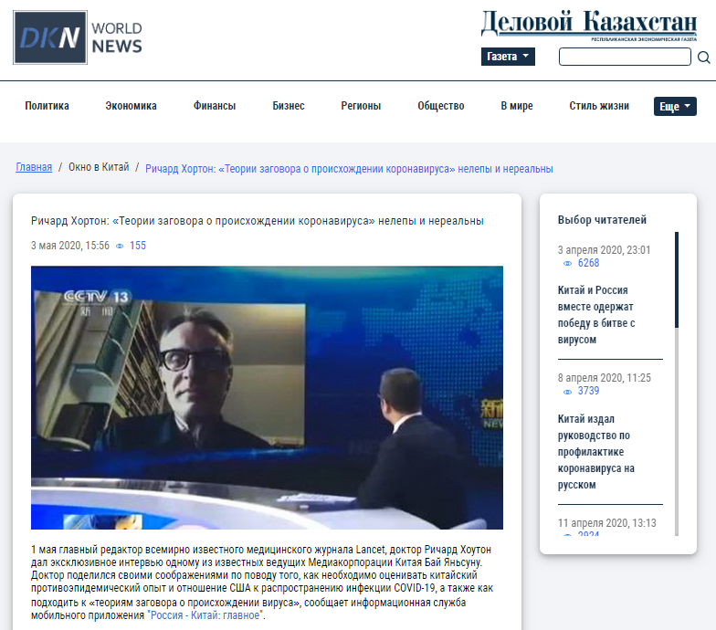 哈薩克斯坦國家經濟周報《哈薩克斯坦實業報》:《〈柳葉刀〉總編接受白巖松專訪》《理查德·霍頓:病毒起源陰謀論是荒唐可笑的》