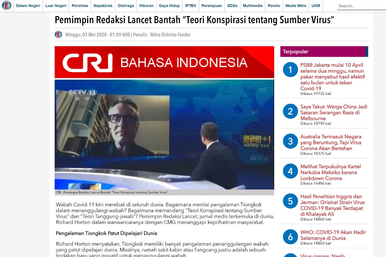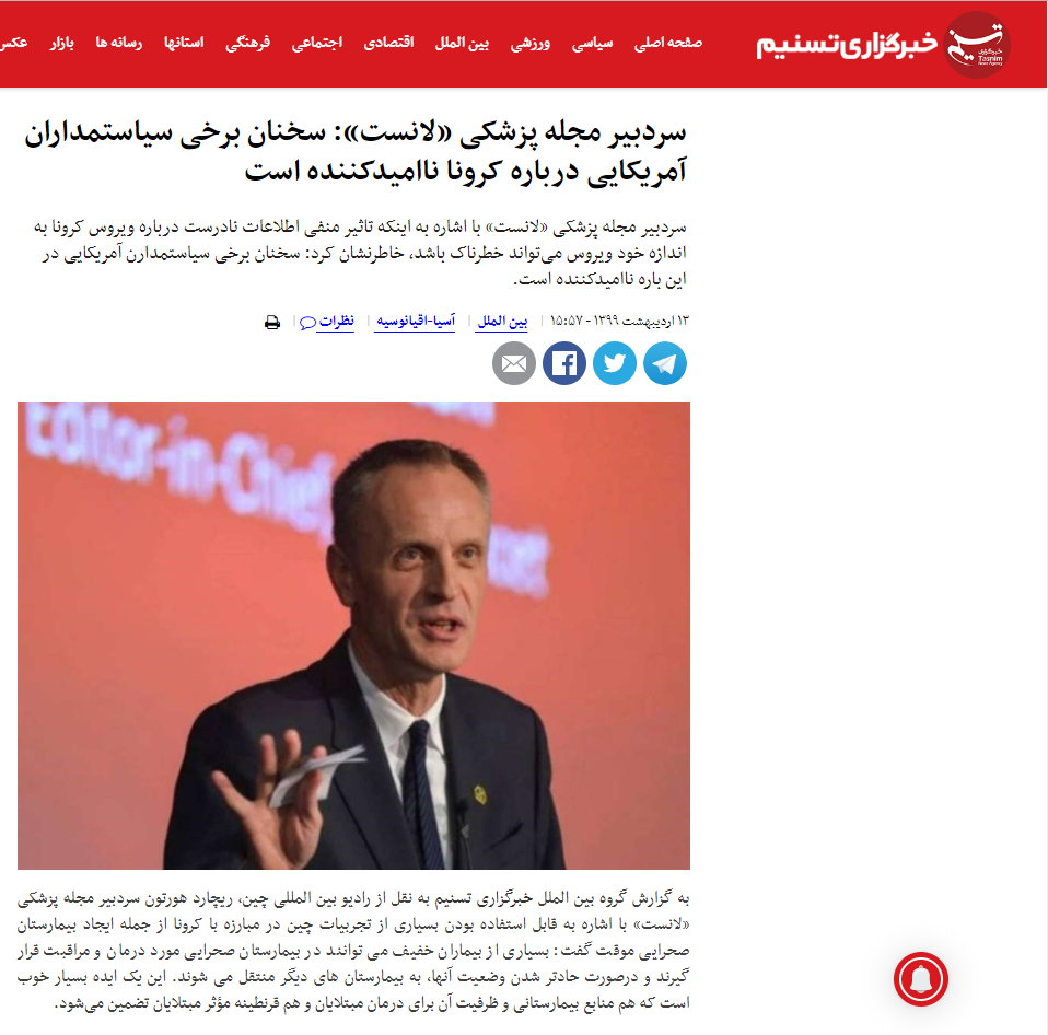 伊朗主流媒體“環球在線”網站發布報道《〈柳葉刀〉總編:有關病毒起源的陰謀論很可笑》。