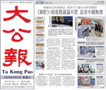 《大公報》:《柳葉刀》總編“病毒陰謀論不實 追責中國無理”↓