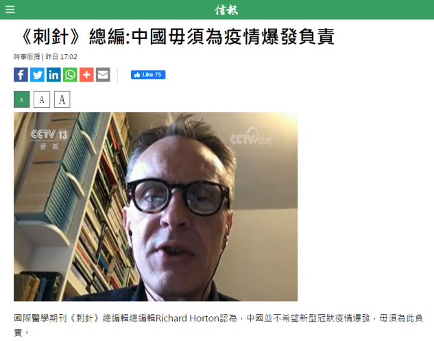 香港01:《柳葉刀》總編:指責中國是病毒傳播源頭沒用也不真實↓