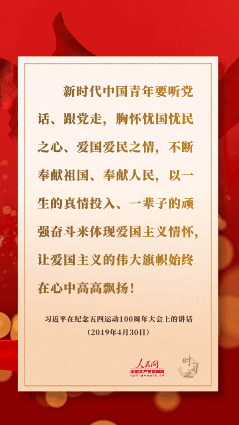 新時代中國青年要聽黨話、跟黨走,胸懷憂國憂民之心、愛國愛民之情,不斷奉獻祖國、奉獻人民,以一生的真情投入、一輩子的頑強奮斗來體現愛國主義情懷,讓愛國主義的偉大旗幟始終在心中高高飄揚!