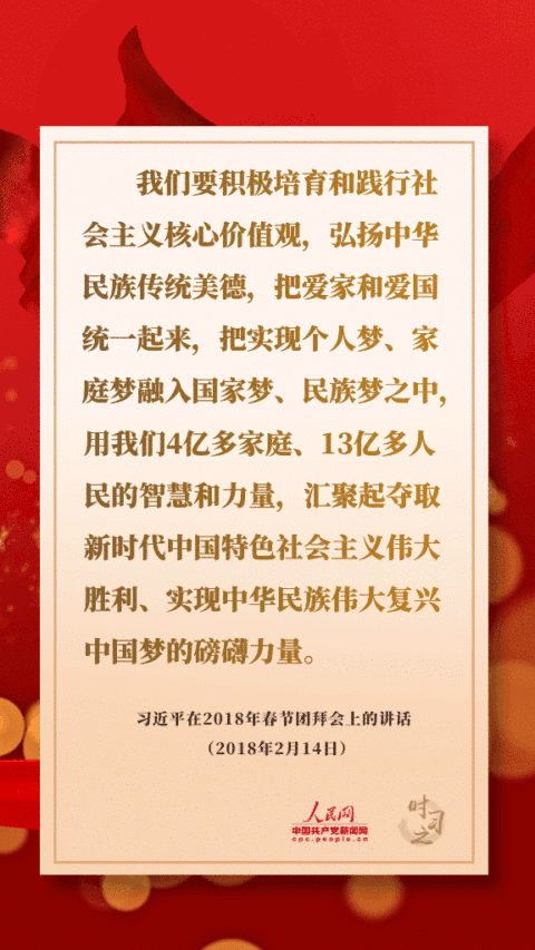 我們要積極培育和踐行社會主義核心價值觀,弘揚中華民族傳統美德,把愛家和愛國統一起來,把實現個人夢、家庭夢融入國家夢、民族夢之中,用我們4億多家庭、13億多人民的智慧和力量,匯聚起奪取新時代中國特色社會主義偉大勝利、實現中華民族偉大復興中國夢的磅礴力量。