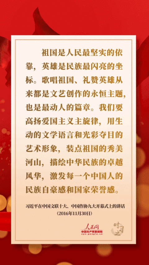 祖國是人民最堅實的依靠,英雄是民族最閃亮的坐標。歌唱祖國、禮贊英雄從來都是文藝創作的永恒主題,也是最動人的篇章。我們要高揚愛國主義主旋律,用生動的文學語言和光彩奪目的藝術形象,裝點祖國的秀美河山,描繪中華民族的卓越風華,激發每一個中國人的民族自豪感和國家榮譽感。
