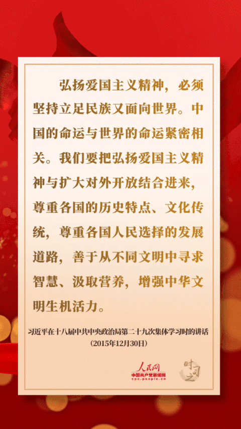 弘揚愛國主義精神,必須堅持立足民族又面向世界。中國的命運與世界的命運緊密相關。我們要把弘揚愛國主義精神與擴大對外開放結合進來,尊重各國的歷史特點、文化傳統,尊重各國人民選擇的發展道路,善于從不同文明中尋求智慧、汲取營養,增強中華文明生機活力。