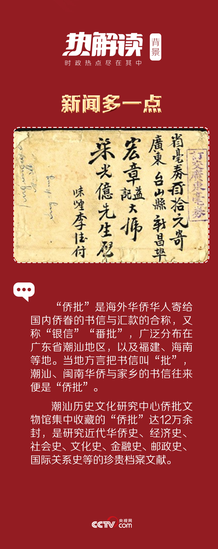 在潮汕方言中,“批”即是“信”的意思,是海外僑胞通過民間渠道寄給家鄉眷屬的書信和匯款憑證的合稱。紙紙僑批,寄托著潮汕僑胞濃濃的鄉愁。其中,有對家人的牽掛,有對家鄉的眷戀,更有對祖國繁榮昌盛的祝愿和希望。