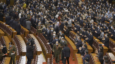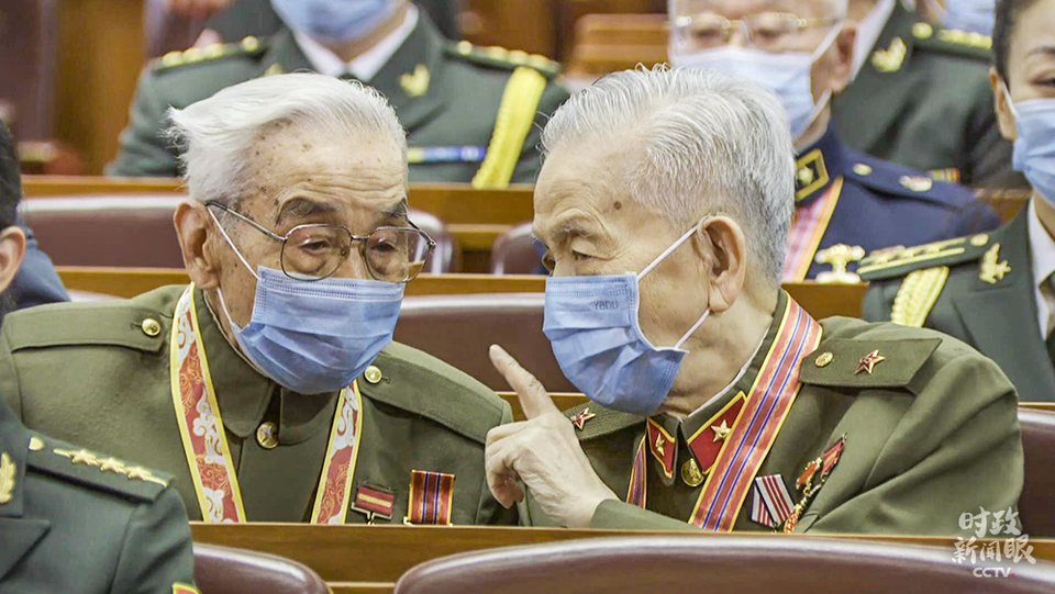 △紀念大會結束后,老英雄們陸續離場。(總臺央視記者王威拍攝)