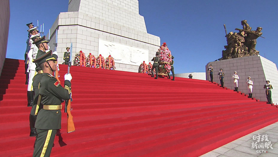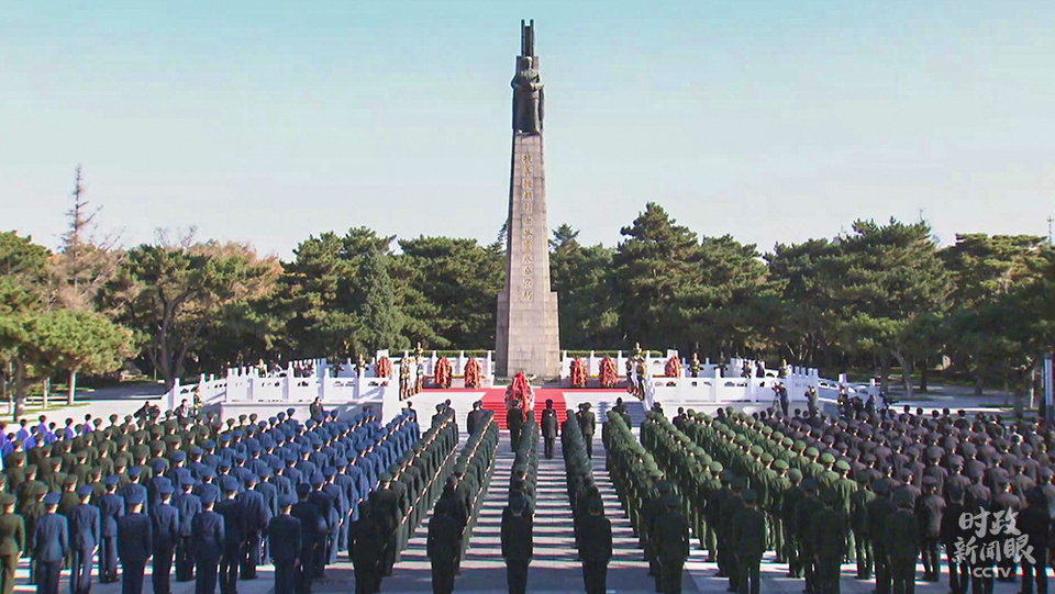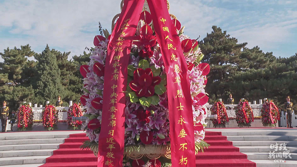 △遼寧沈陽抗美援朝烈士陵園,以習近平名義敬獻的花籃擺放在烈士紀念碑正前方。(總臺央視記者雍凱鈞提供)