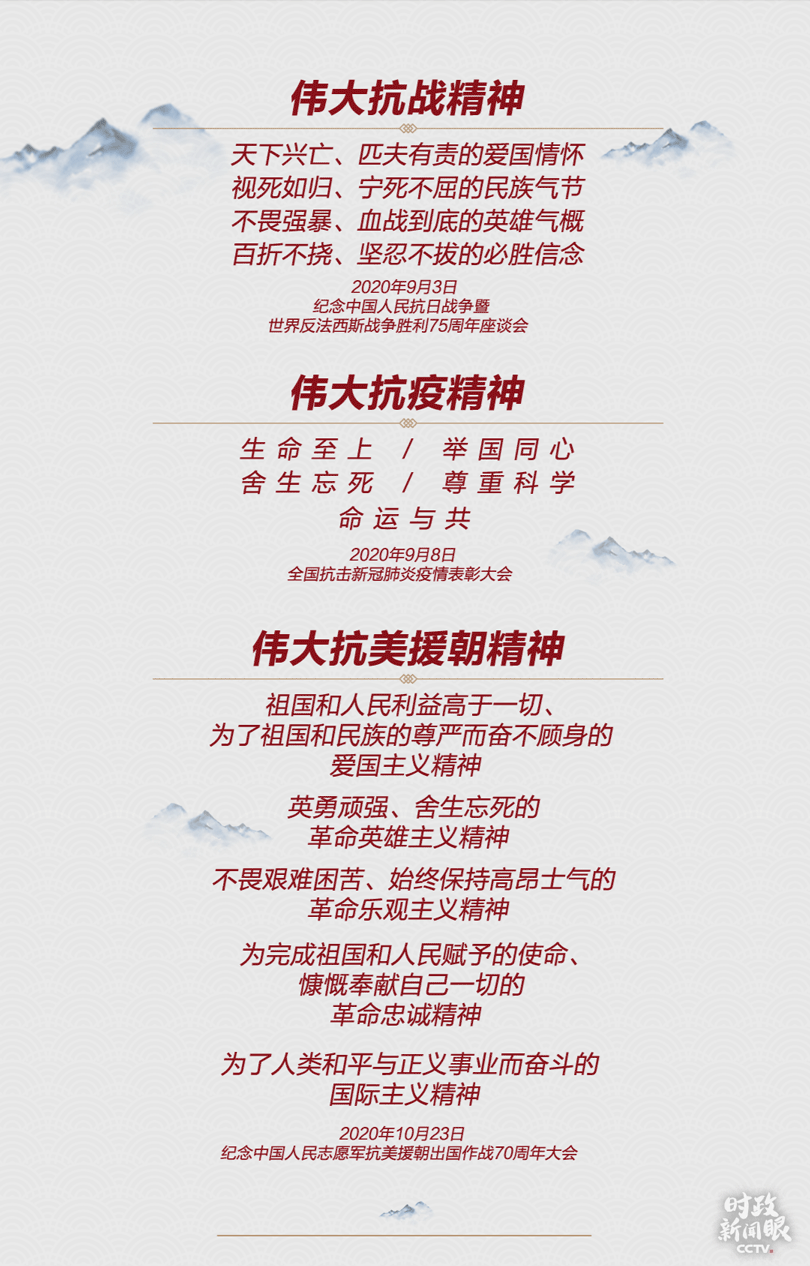 9月3日,習近平在紀念中國人民抗日戰爭暨世界反法西斯戰爭勝利75周年座談會上說,中國人民在抗日戰爭壯闊進程中孕育出的偉大抗戰精神,“是中國人民彌足珍貴的精神財富”。