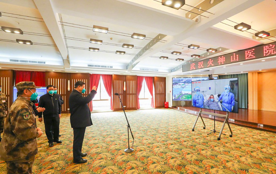 △3月10日,習(xí)近平在武漢火神山醫(yī)院指揮中心,視頻連線81歲的老年患者。