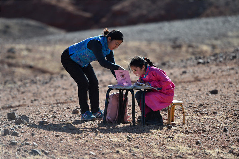 9歲的策耿(右)在家附近的戈壁上網課(4月1日攝)。策耿是內蒙古自治區阿拉善左旗蒙古族學校四年級學生。由于疫情防控,策耿父母長期雇傭的一名外省羊倌沒能回到當地,一家人只好回到阿拉善左旗烏力吉蘇木溫都爾毛道嘎查的牧區家中照看羊群。期間,策耿一邊協助父母,一邊上網課。新華社記者 劉磊 攝