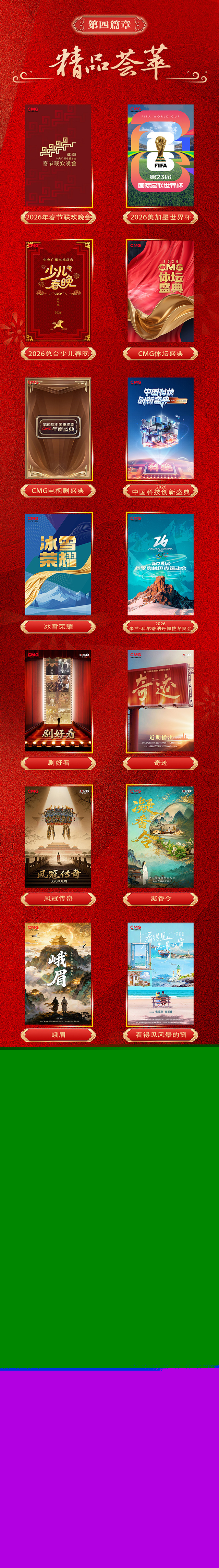 “精品薈萃”篇章匯聚總臺電視劇、大型晚會、紀錄片、重大賽事等各類節(jié)目,以滿屏佳作彰顯旗艦頻道擔當。總臺首部原創(chuàng)自制精品短劇集《奇跡》展現(xiàn)深圳經(jīng)濟特區(qū)成立以來波瀾壯闊的發(fā)展歷程;首次推出的文藝訪談節(jié)目《劇好看》以創(chuàng)新形式推介總臺大劇,深度解讀作品藝術(shù)價值與時代精神;《鳳冠傳奇》《凝香令》《峨眉》《看得見風(fēng)景的窗》等系列文化微短劇,分別聚焦明代宮廷傳奇、中醫(yī)文化傳承、守護峨眉山水和海島詩意生活等主題。2026年,綜合頻道還將播出《生命樹》《太平年》《主角》《好好的時代》《偉大的長征》等電視劇,以匠心打造的精品劇集,持續(xù)為觀眾帶來高品質(zhì)的觀劇體驗。《2026年中央廣播電視總臺春節(jié)聯(lián)歡晚會》《2026年中央廣播電視總臺少兒春晚》等大型晚會將繼續(xù)陪伴觀眾歡度佳節(jié),《CMG電視劇盛典》《2026中國科技創(chuàng)新盛典》《CMG體壇盛典》等年度盛典精彩紛呈;體育賽場同樣令人期待,2026米蘭冬奧會、2026美加墨世界杯等國際頂級賽事將帶來激情澎湃的競技盛宴。