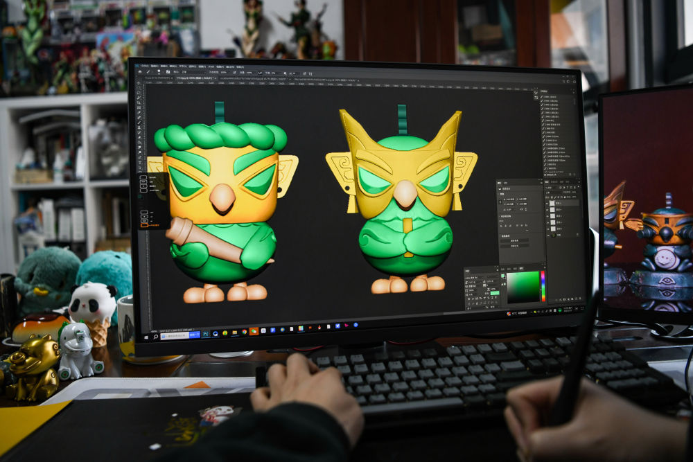 2025年3月1日,文創(chuàng)產(chǎn)品策劃運(yùn)營師曾舟在位于四川成都的辦公室內(nèi)完善文創(chuàng)產(chǎn)品細(xì)節(jié)。他以三星堆青銅神樹、青銅縱目面具、青銅獸面等文物為創(chuàng)作藍(lán)本,結(jié)合潮玩元素設(shè)計(jì)的文創(chuàng)作品廣受歡迎!拔蚁胱龅牟皇峭婢呖煜,而是有內(nèi)容、有溫度、有意義的文化IP,讓年輕一代隨手摸到沉淀千年的文化。”曾舟說。
