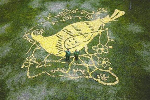 3日上午,郫都區(qū)置信逸都小區(qū)內(nèi),老何和搭檔花了近4個小時在小區(qū)中庭的大草地上“畫”出了一幅銀杏新作——臘梅花開枝頭,畫眉回眸而棲。“還要再改改,看上去全是線條。”老何對這幅銀杏圖不是很滿意。吃過午飯,他讓搭檔老王再去拉些銀杏葉來,“把畫眉用葉子填滿,把線條用草地本身體現(xiàn),讓它更渾然一體,更有沖擊力。”