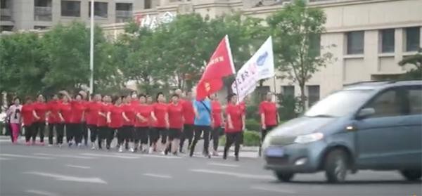 青島市李滄區(qū)的“馬路暴走團(tuán)”:每晚6點(diǎn)后,數(shù)十名中老年人統(tǒng)一著裝,排著整齊的隊(duì)伍,放著勁爆的音樂在雙向八車道的機(jī)動車道上甩手疾走。