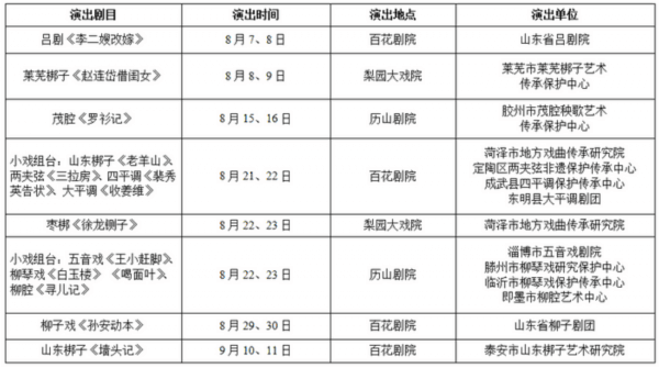 參演劇目有呂劇《李二嫂改嫁》、柳子戲《孫安動本》、山東梆子《墻頭記》、五音戲《王小趕腳》、兩夾弦《三拉房》、萊蕪梆子《趙連岱借閨女》、四平調《裴秀英告狀》、茂腔《羅衫記》、山東梆子《老羊山》、大平調《收姜維》、棗梆《徐龍鍘子》、柳琴戲《白玉樓》、柳琴戲《喝面葉》、柳腔《尋兒記》。展演涉及13個戲曲院團,省、市、縣三級優秀戲曲院團各個在冊,其中省級院團2個,市級院團4個,還有活躍在基層一線的縣級院團7個。主要有山東省呂劇院、山東省柳子劇團、淄博市五音戲劇院、泰安市山東梆子藝術研究院、臨沂市柳琴戲傳承保護中心、菏澤市地方戲曲傳承研究院、萊蕪市萊蕪梆子劇團、滕州市柳琴戲劇團、膠州市茂腔秧歌藝術傳承保護中心、即墨市柳腔藝術中心、定陶區兩夾弦劇團、成武縣四平調劇團、東明縣大平調劇團等。
