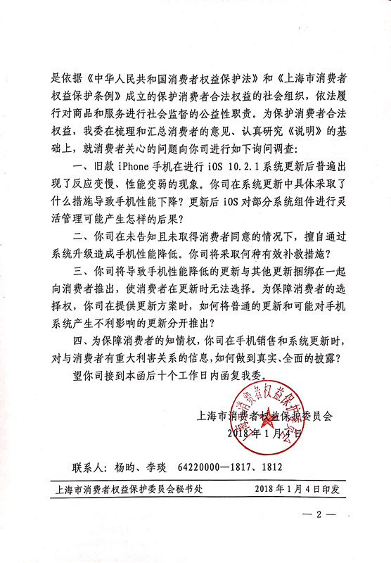 根據《查詢函》的要求,蘋果公司應于2018年1月19日前給予上海市消保委答復。