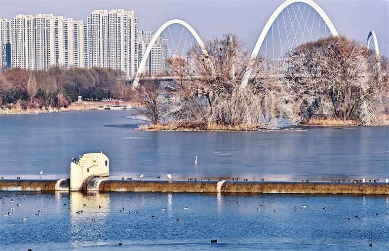 1月8日,山西省太原市汾河景區北中環橋附近,大量水鳥在水面上嬉戲覓食,盡顯人與自然和諧之美。(郭苑甫)