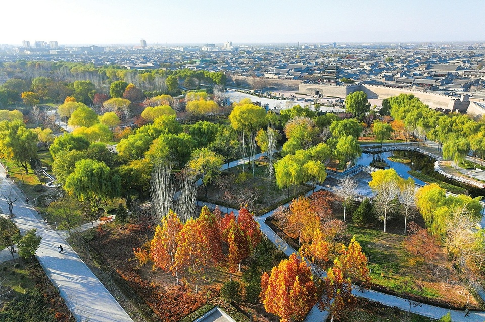 11月22日,山西晉中平遙古城迎薰公園冬景如畫,公園內(nèi)的健身步道、人工湖、音樂噴泉廣場與千年古城相互映襯,盡顯歷史韻味與自然之美。(梁生仁)