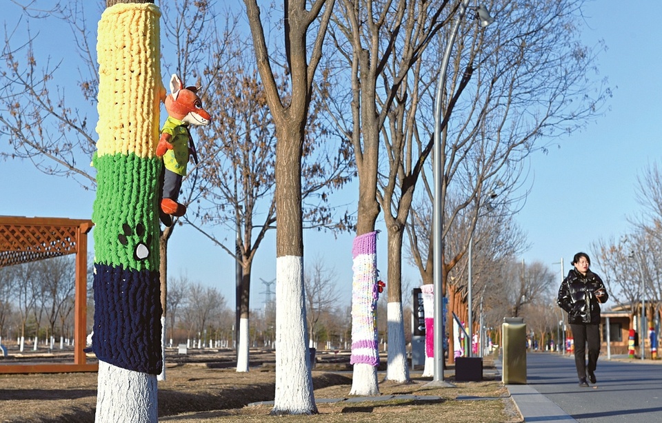 一月八日,太原植物園內,部分樹木“穿”上了手工編織的“毛衣”,活力滿滿的多巴胺配色為冬日增添了別樣生機,成為園區內一道亮麗的風景線,吸引游人拍照留念。(王若淵)