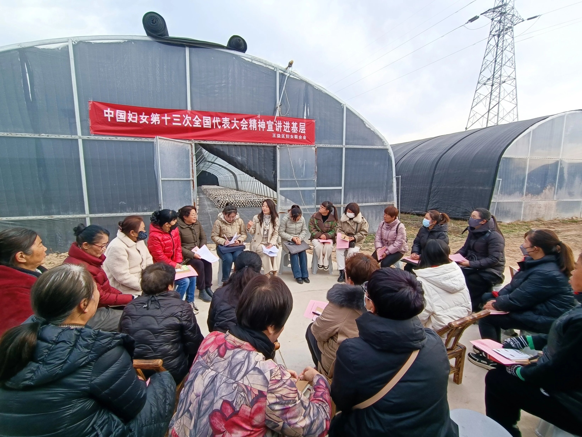 初冬的風從田埂那邊吹過來,把身后連片的大棚吹得塑料皮一鼓一鼓的,黑色遮陽網在空中微微起伏。大棚前一塊水泥空地上,二十來把小板凳和馬扎圍成一圈。大棚門上“中國婦女第十三次全國代表大會精神宣講進基層”的橫幅在灰白的天幕下顯得格外醒目。女人們三三兩兩坐滿一圈,厚羽絨服、棉襖把每個人裹得嚴嚴實實,有人戴著口罩,有人把圍巾往上扯了扯,手里都捏著一張粉色宣講提綱。有人一邊聽一邊在紙上劃圈,有人不時抬頭看一眼橫幅,眼睛里有認真,也有點新鮮。