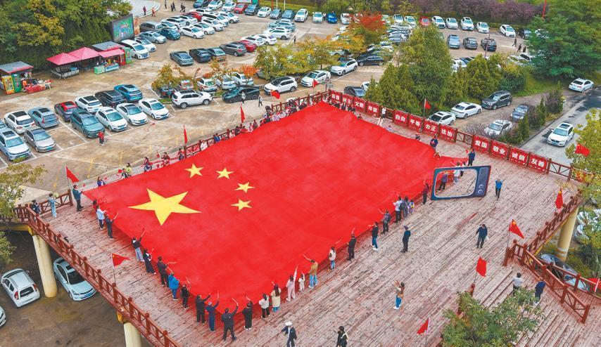 10月2日,游客在銅川市耀州區薛家寨景區紅軍橋共同展開巨幅國旗,祝福祖國繁榮昌盛。 受訪單位供圖