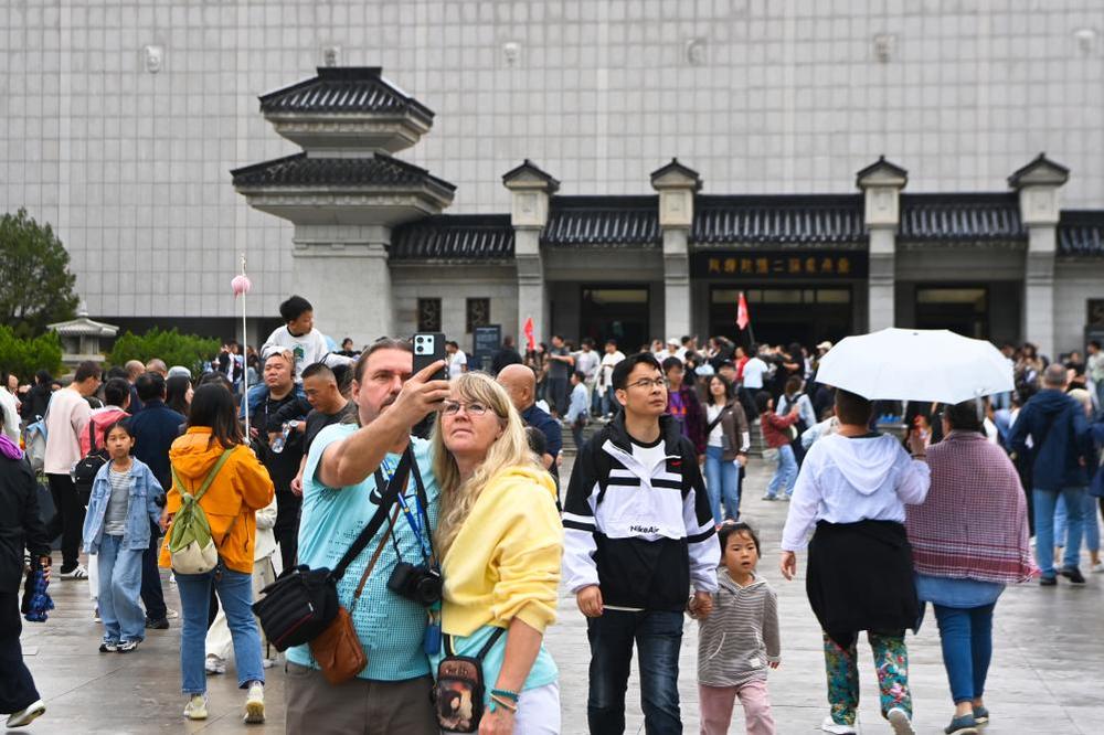 10月1日,外國游客在秦始皇帝陵博物院參觀。新華社發(fā)(張?zhí)熘鶖z)