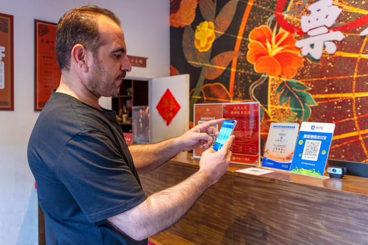 外國游客在西安景區(qū)體驗(yàn)支付寶掃碼支付服務(wù)。新華社記者李一博攝