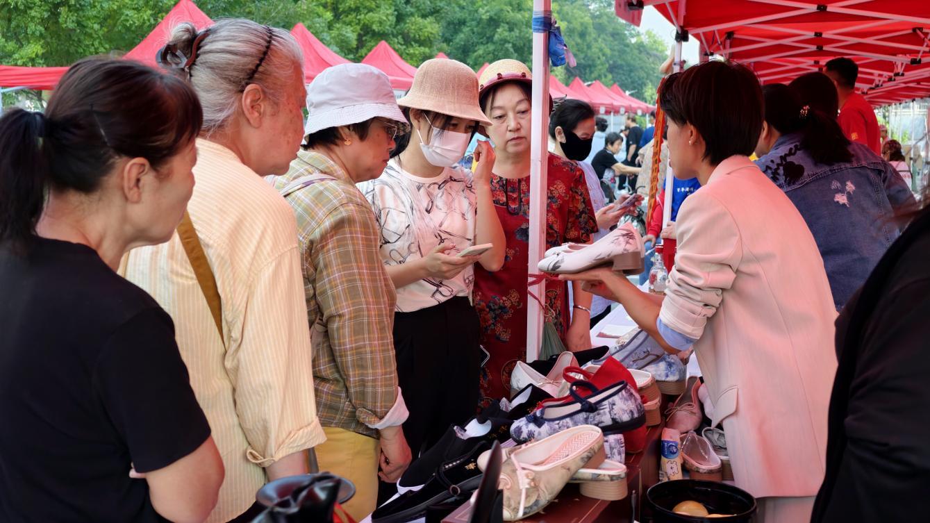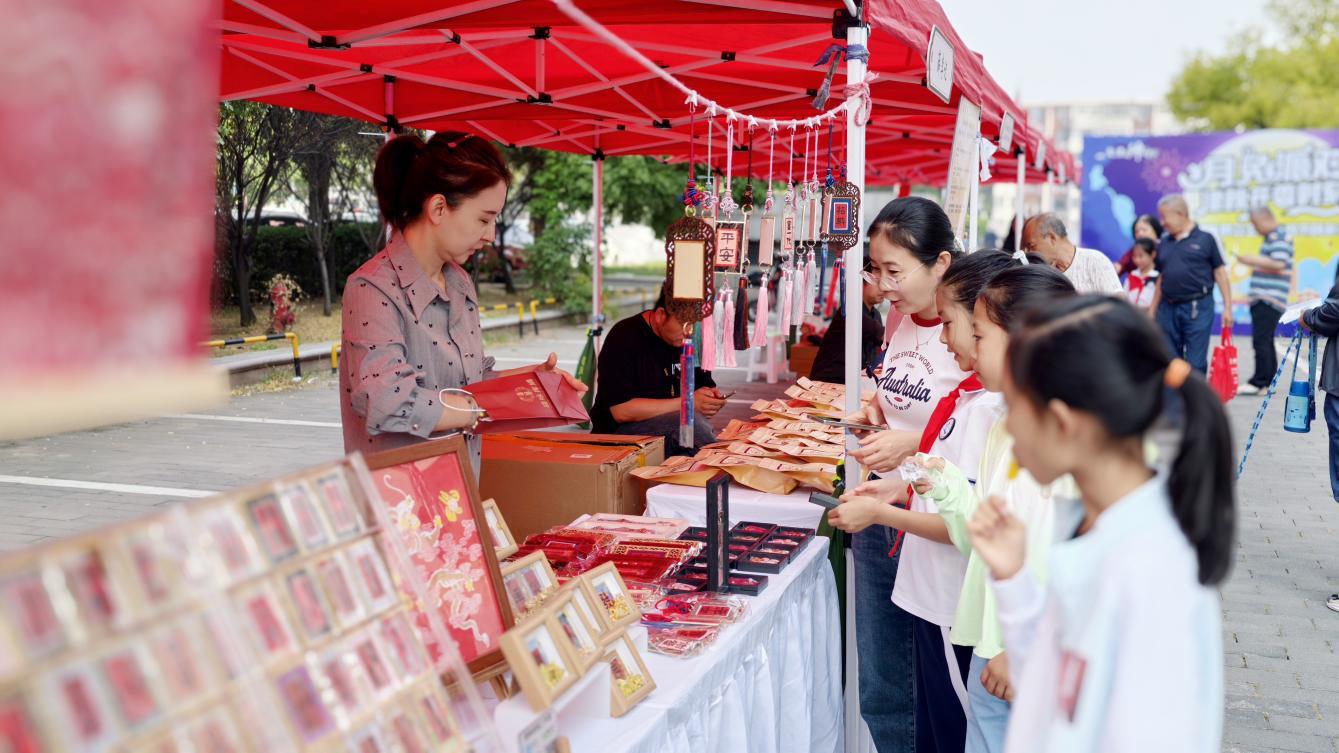 市集匯聚二十余位非遺傳承人與文創(chuàng)手工達人,集中呈現(xiàn)中藥香、剪布技藝、盤扣、津派風(fēng)箏、銹鞠、點翠、剪紙、庫絹等多項非遺項目。市民不僅可近距離觀賞精湛技藝,更可親身參與互動體驗。在傳承人指導(dǎo)下,大家手執(zhí)工具細致創(chuàng)作,一幅幅中秋剪紙、國慶庫絹逐漸成形,非遺技藝真正“活”在了百姓指尖。