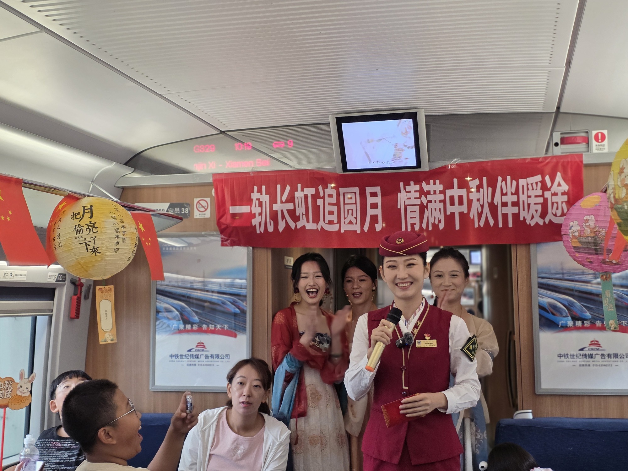 央廣網(wǎng)天津10月6日消息(記者韓雨晨)日前,由天津西開往廈門北的G329次列車化身移動的“中秋樂園”,一場以“月滿華誕 情暖旅途”為主題的特色活動溫情啟幕,為旅途增添別樣團(tuán)圓味。