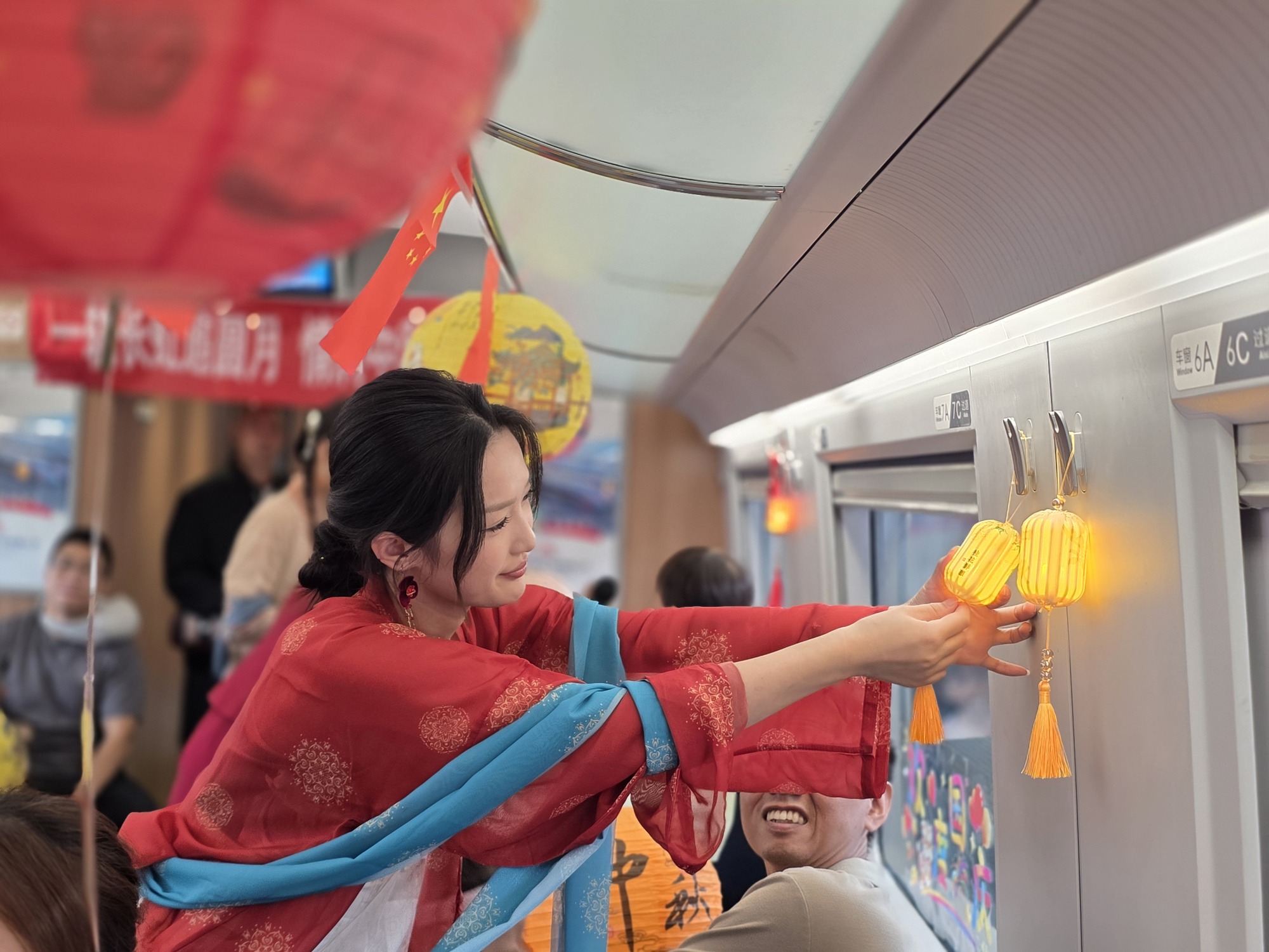 活動中,列車乘務(wù)人員化身詩詞達(dá)人,與旅客“吟詩答對”親切互動,一同探尋古人詩詞之中中秋佳節(jié)的唯美意境。此外,乘務(wù)人員還邀請旅客動手制作“中秋花燈”,猜燈謎贏禮品,表演《花好月圓》等歌曲節(jié)目,讓旅客在旅途之中感受濃濃的節(jié)日氛圍。