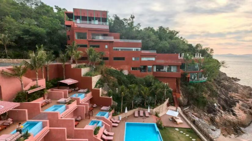 廣東江門一小車沖破護欄懸掛湖邊